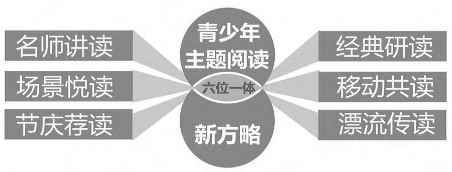 [摘 要]“ 启发性、智慧型、互动式,能产生大共鸣、大认同、大激励的具有特殊意义和作用”的青少年主题阅读,是对青春、对成长、对奋斗的美好致礼。在砥砺奋进的新时代,要通过名师讲读、经典研读、场景悦读、移动共读、节庆荐读、漂流传读的“六位一体”的创新驱动和深度融合,让青少年主题阅读成为全民阅读更有生命力的“基础”、更有创造力的“重点”,让主题阅读“穿透灵魂”的新方略成为对青春的最好致礼。 阅读如何传承?如何创新?如何让每个人青春都“炯炯有神”?这既是青少年主题阅读的一个热门话题,更是事关青少年心灵成长的一个重要命题。在人类的阅读行为与活动里,除了主体性、主动性特质,主题性早就成了潜移默化的方法与策略选择。阅读的主题性,对青少年成长的特殊作用,甚至超过了主体性和主动性。“每一个挥汗如雨的青春,其中都浸泡着一本使之沸腾的书;每一个坚强不屈的青春,都有着一本支撑着它一直向前的书。”[1]毋庸置疑,主题阅读是对青春、对成长、对奋斗的美好致礼。 一、主题阅读让灵魂不缺席 青少年是我国促进全民阅读的重点对象人群, [2]也是主题阅读推广的主要对象人群。青少年阅读的主题,是“穿透灵魂”的思想、情感,是激励奋进的旗帜、号角,是加快精神发育的引擎、源泉。它不但能保证阅读内容的积极向上,保证阅读方式的科学健康,还能保证阅读成效的可持续提升。在砥砺奋进的新时代,青少年如何突破碎片化、消遣型阅读的重围,让阅读不偏离、更不脱离“获取知识、增长智慧”的主流轨道?把青少年主题阅读作为新方略来研究、谋划和实施,既是科学智慧的向导,也是人文传承的征程,更是让灵魂在每一次阅读中都不缺席、都浸染其中并被穿透的不二之选、解决之道。 二、主题阅读肩负使命担当职责 青少年的精神发育史就是他的阅读史,有目标、有主题的阅读,能够更好、更快“穿透灵魂”,更深、更久影响他们的学习生活、文化素养、精神世界、成长轨迹。青少年主题阅读不仅肩负了全民阅读先行者的使命,还担当了创新者、接力者的职责。 1.“阅读引导与成长变革”的“先行者” “全民阅读从青少年开始”“全民阅读青少年先行”“青少年阅读是全民阅读的展望”等,这些观点的核心要义就是《全民阅读“十三五”时期发展规划》(下文简称《规划》)里指出的,青少年阅读是“基础”,是“重点”。而只有通过主题阅读推广“穿透灵魂”的主导、带动、激发、鼓励,这一“基础”才会更有生命力,这一“重点”才会更有创造力。围绕2017“第七届书香中国·北京阅读季阅读盛典”校长论坛提出的“阅读引导与成长变革”的话题,芬兰拉赫帝市校长(Marju Markkanen)在演讲中指出,芬兰“建设随处可见的各种主题阅读设施”的做法在青少年阅读引导与成长变革中发挥了积极作用。因此,青少年主题阅读肩负全民阅读“先行者”的使命,不但要体现在思想认识上,更要体现在政策环境营造、载体设施建设等务实推进的所有方面。 2.“寻找一种大智慧”的“创新者” 作为“先行者”的青少年主题阅读,还应该蕴含怎样的独特内涵和责任担当?《领导文萃》杂志1999 年2 月曾刊文指出,“‘主题阅读’更着力于智力圈的沟通、互补和共鸣……‘主题阅读’希望能寻找一种大智慧。”[3] 该文(中国知网所有类别文献中篇名里含有“主题阅读”的最早文献)提出的这段研究性表述,也是把主题阅读定位于“创新者”的深刻诠释。由此可以给出青少年主题阅读的一个明确界定,它既不是一般意义上的知识性、普及型阅读,更不是浏览性、消遣型阅读,而是一种启发性、智慧型、互动式,能产生大共鸣、大认同、大激励的具有特殊意义和作用的创新型阅读方法和策略。用心“寻找一种大智慧”,这比“主题阅读是一种针对同一主题,在一定时间内阅读大量书籍的方法”[4] 的定义更能凸显创新意义和核心价值。 3.“春风化雨,薪火相传”的“接力者” 全民阅读活动开展至今已走过11 个年头,但影响力大、持续推进的青少年主题阅读活动很少。互联网上报道的“可一杯”青少年主题阅读大赛(由扬子晚报社等联合举办)、2012 年度“青少年主题阅读”推荐书目评选(由中国教育新闻网主办)这两个活动有一定影响力,但目前只有全国妇联1993 年发起组织并已举办25 届的全国青少年爱国主义读书教育活动,真正体现了作为一个长期性、持续性方略的“穿透灵魂”影响深远的责任担当。《经济日报》在以《春风化雨润心田》为题的该活动10 年综述里指出,“平均每届有3000 多万名青少年参加, 已有450 多万名学生在读书活动中获奖”。《中国青年报》2017年7 月19 日报道了该主题阅读活动前24 年的数据——“吸引7.8 亿人次青少年参加并从中受到熏陶和教育”。通过实施主题阅读这一新方略,组织演讲比赛、征文比赛、知识竞赛、参观、社会调查、义务劳动、主题夏令营等各具特色、丰富多彩的活动来导读、导思、导写、导行,把爱国主义的种子播撒在亿万孩子们的心田,让民族精神在一代又一代青少年的心灵中扎根,从而也让活动本身成为“春风化雨,薪火相传”的“接力者”。 三、新方略:指南针+ 主引擎+ 加速器+孵化器+ 新主流+ 新选择 《中国新闻出版广电报》2018 年2 月5 日以《加快构建全民阅读推