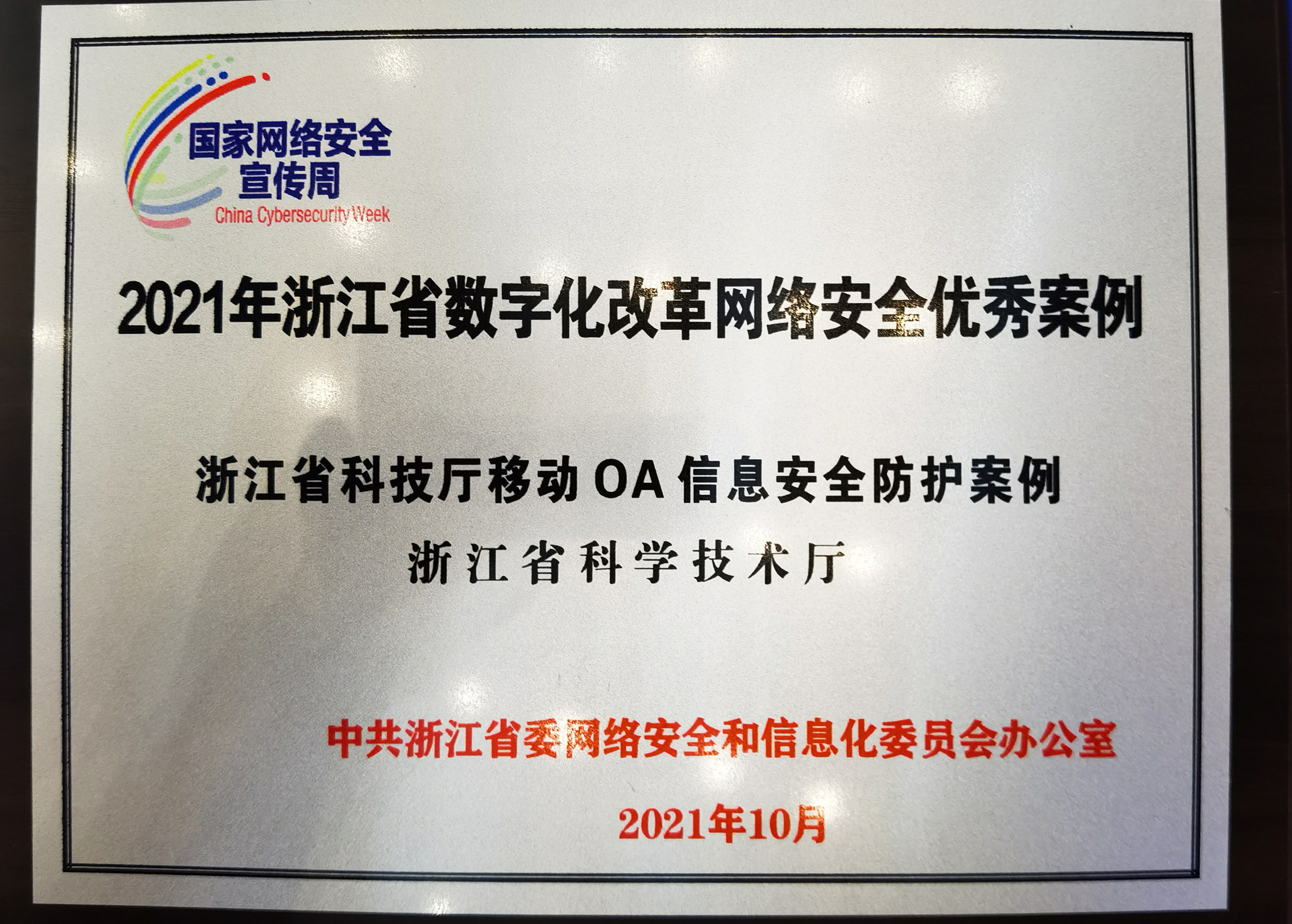 | 喜讯!省科技厅移动OA信息安全防护案例入选2021年浙江省数字化改革网络安全优秀案例 | |