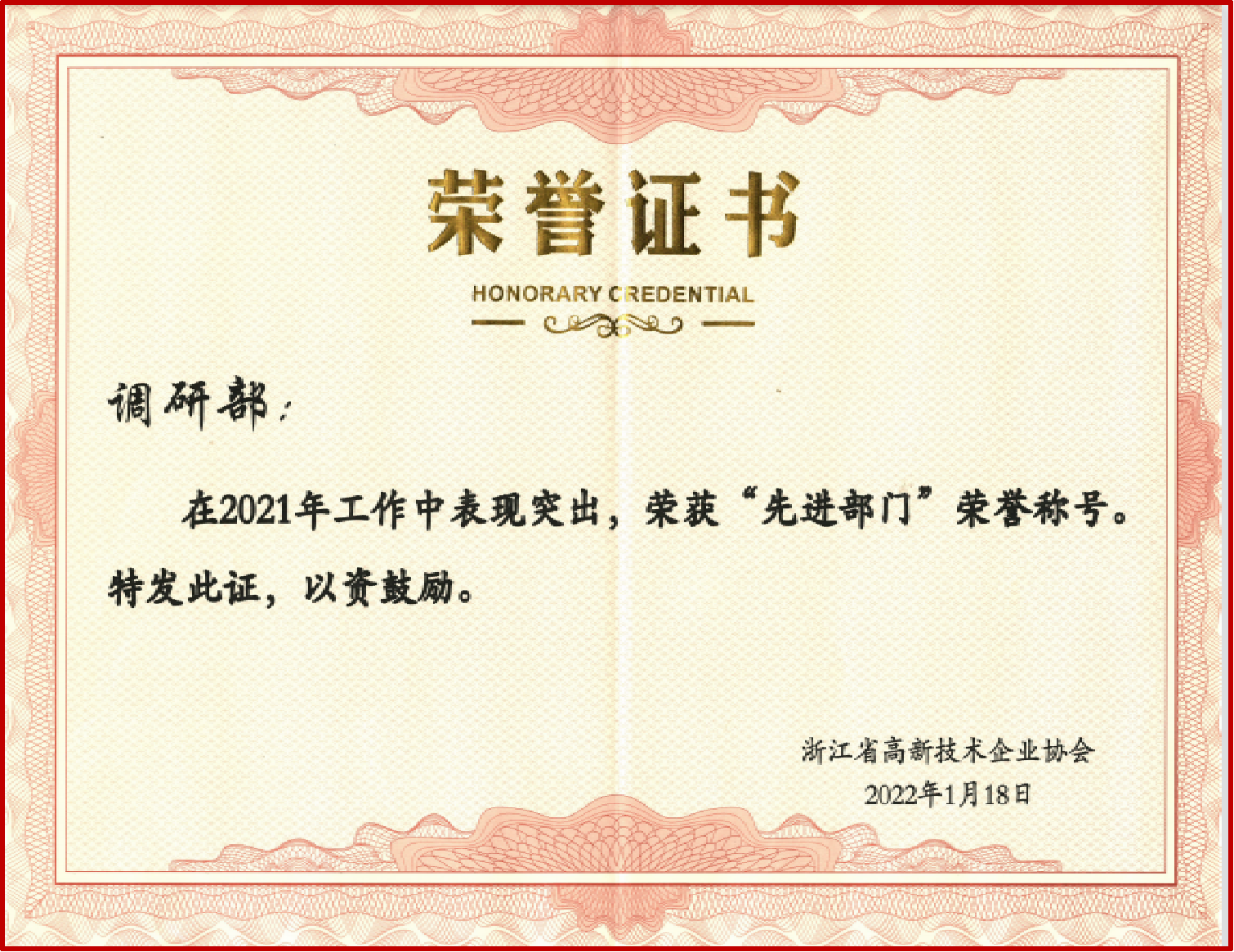 | 喜讯!我院荣获2021年度浙江省高新技术企业协会先进部门 | |