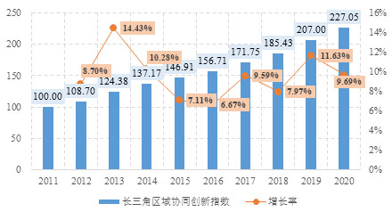 报告显示,长三角区域协同创新指数从2011年的100分(基期)增长至2020年的227.05分,较2011年翻一番,同比增长9.69%,年均增速达到9.54%,长三角整体协同创新水平稳步提升,一体化的创新格局基本形成。从5项一级指标变化情况来看,成果共用指标增幅最大,从2011年的100分提高到2020年的292.15分,年均增速达到12.65%;其次是资源共享指标,从2011年的100分上升到2020年的246.32分,年均增速达到10.54%;第三是创新合作指标,从2011年的100分增长到2020年的224.81分,年均增速达到9.42%;相对而言,产业联动和环境支撑两个指标发展增速较为滞缓,是长三角区域协同创新未来发展中需要关注的重点所在。