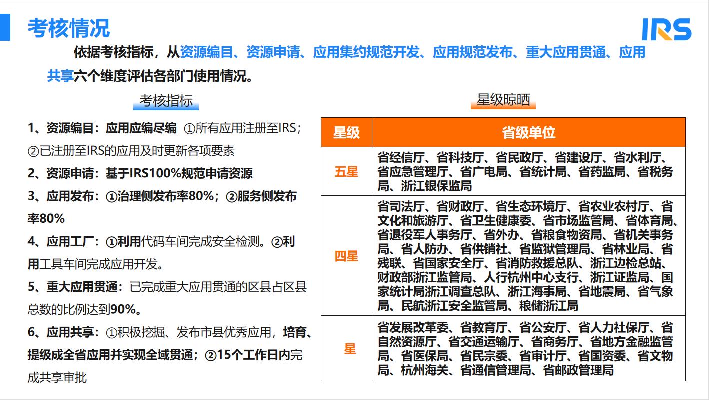 10月25日,在省大数据局召开的一体化数字资源平台(IRS)省级部门工作会议上,省科技厅 “科技攻关在线”等数字化改革重大应用在IRS的资源编目、资源申请、应用发布、应用工厂、重大应用贯通、应用共享等六个维度考核指标的星级晾晒中获五星级。 我院作为科技厅数字化改革重大应用的技术支撑和保障部门,在省科技厅的指导下,依据“1612”体系构架,以一体化数字资源系统为核心抓手,推动一体化智能化公共数据平台建设,集成“四目录”“四机制”、“科技攻关在线”等重大应用,实现从“一本账”到“一张网”的落地,过程中做到资源目录应编尽编,要素填写规范准确,动态及时更新,重大应用在全省贯通率达到100%;为科技厅在省改革办2022年度数字化改革考评中取得好成绩做好技术支持。 后续,将继续做好技术支持和保障工作,在应用工厂、代码托管上进一步探索和实践。 |