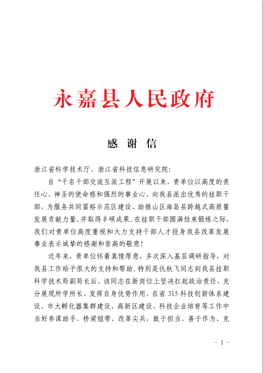 | 省信息院挂职干部仇秋飞得到永嘉县人民政府来信感谢 | |