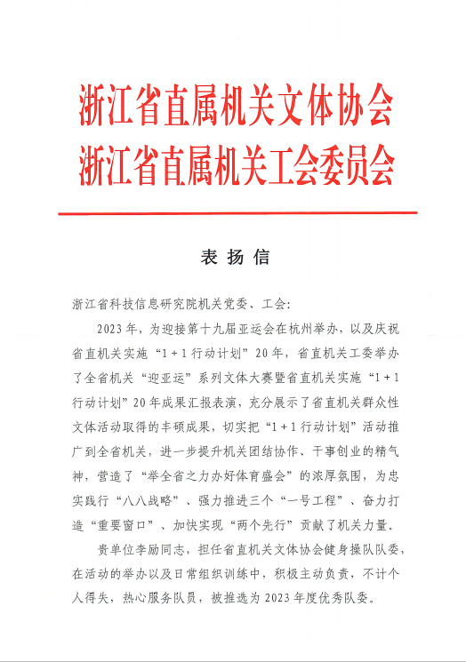 近日,浙江省直属机关文体协会、浙江省直属机关工会委员会来信对省信息院李励予以表扬。 李励同志在担任省直机关文体协会健身操队队委期间,积极主动负责,不计个人得失,热心服务队员,被推选为2023年度优秀队委。 李励同志认真负责的态度和乐于奉献的品质,充分展现了院干部职工的优良作风,值得全体干部职工学习。 |