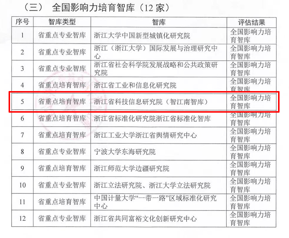 9月3日,浙江省哲学社会科学工作办公室公布了2023年度全国影响力建设(培育)智库评估结果。我院成功入选2023年度全国影响力培育智库。 作为全省12家入选单位之一,省信息院将继续探索智库高质量发展路径,围绕国家重大科技决策和科技改革发展需求,聚焦科技前沿及创新发展战略等,不断加强前瞻性与储备性研究,提高人才自主培养质量,提升智库研究与决策服务水平,为推动发展新质生产力,加快实现高水平科技自立自强提供高质量科学决策咨询服务。 |