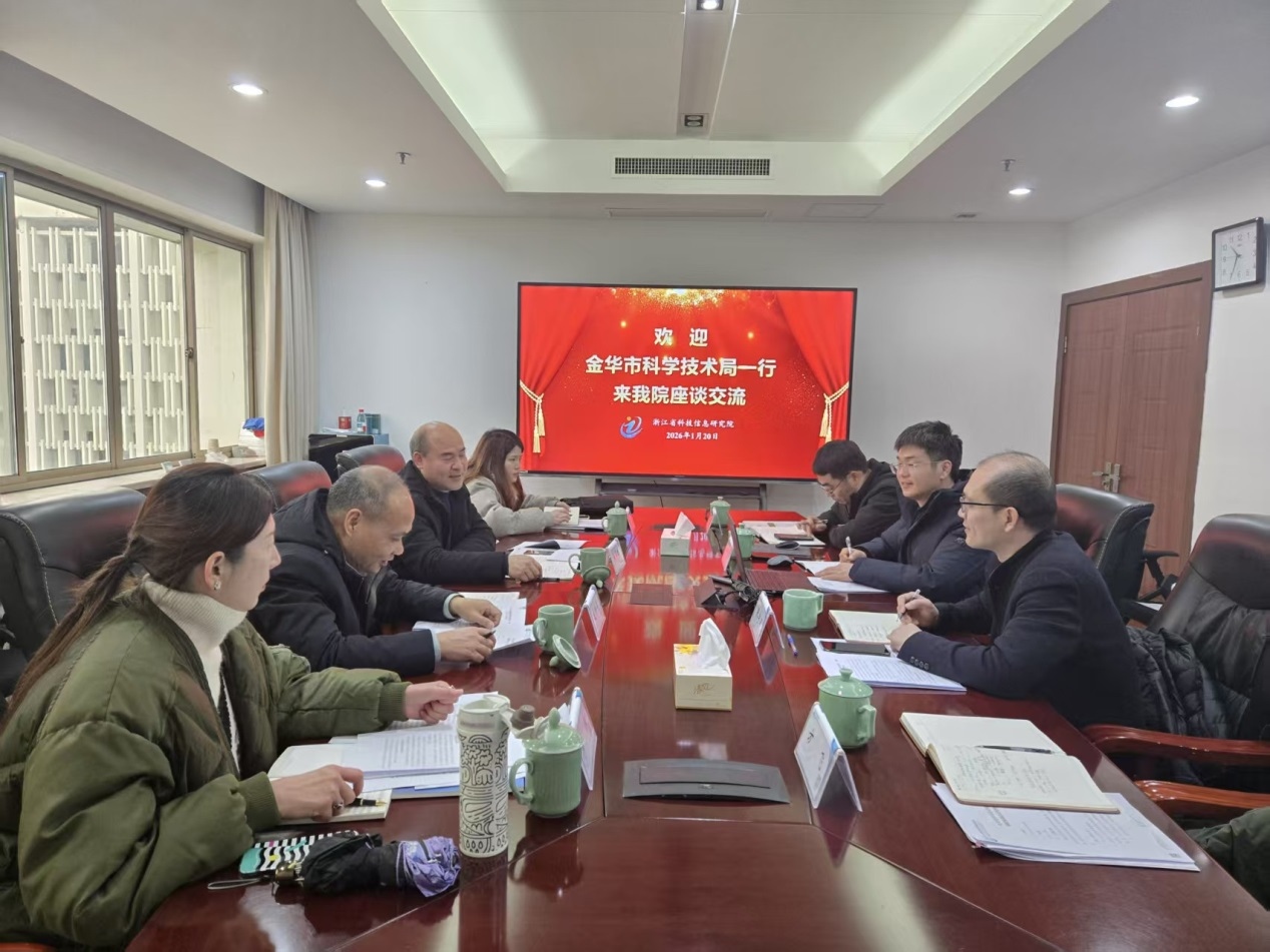 1月20日,金华市科学技术局党组成员赵洪亮一行4人来省科信院调研。院党委专职副书记张宇环,查新中心相关人员参会。
